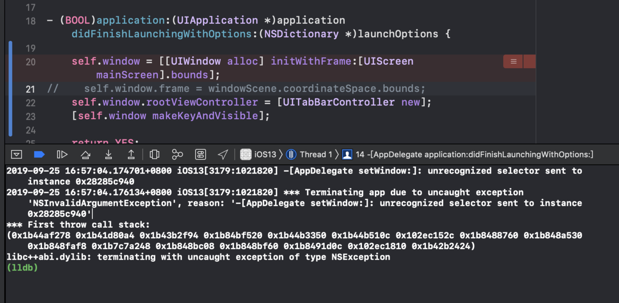 前几天更新好Xcode11后,运行旧项目,相安无事,心里捏了一把汗,终于没有跟往年那样一更新就给你一大堆报错了。刚才突发奇想,使用Xcode11新建iOS项目时,如果你跟往常一样在Appdelegate的- (BOOL)application:(UIApplication *)application didFinishLaunchingWithOptions:(NSDictionary *)launchOptions方法中创建根控制器,会崩溃报错: