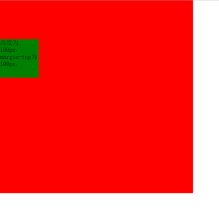 <!DOCTYPE html><html lang="en"><head> <meta charset="UTF-8"> <title>margin</title> <style> *{padding:0; margin:0; border:0;} .father{ width: 500px; height: 500px; background: red; } .son{ width: 100px; height: 100px; background: green; margin-top: 100px; } </style></head><body> <div class="father"> <div class="son">高度为100px,margin-top为100px。</div> </div></body></html> |