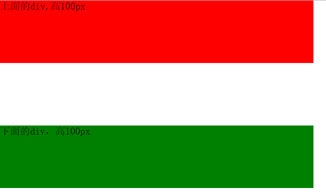 <!DOCTYPE html><html lang="en"><head> <meta charset="UTF-8"> <title>水平方向的两个盒子</title> <style> *{ margin:0; padding:0; } .top{ width: 500px; height: 100px; background: red; } .middle{ margin-top: 100px; margin-bottom:50px; } .footer{ width: 500px; height: 100px; background: green; } </style></head><body> <div class="top">上面的div,高100px</div> <div class="middle"></div> <div class="footer">下面的div,高100px</div></body></html> |
