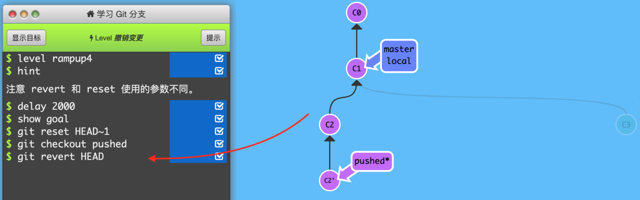 复制代码该副本需要:分别撤销 local(本地) 分支和 pushed(远程) 分支上的最近一次提交。 初始如下: