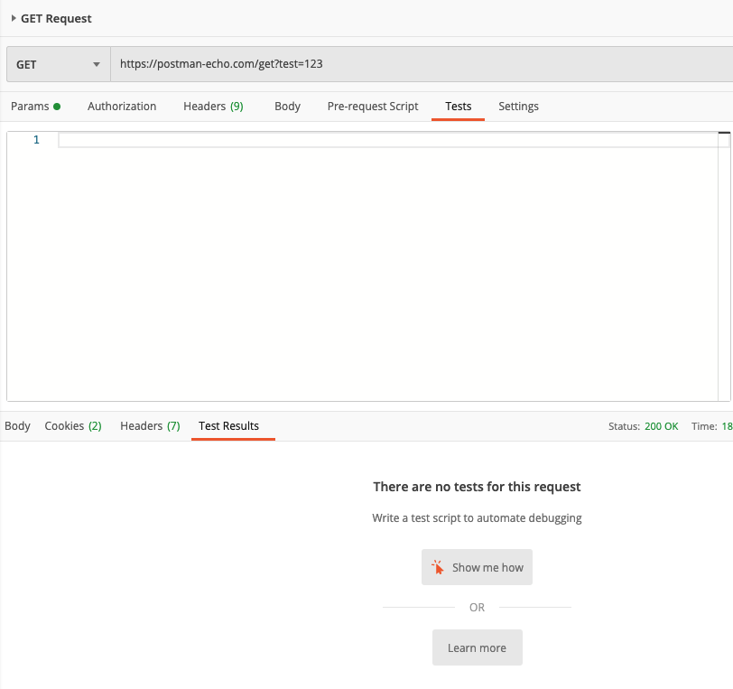 每个请求都有一个 Tests 的 Tab,在 Tests 下方的编辑框中可以自行编写代码,相应的每个响应也都有一个 TestResult,在这里展示每一个 Test 的执行结果,是通过还是失败,如果是失败还有具体的原因。